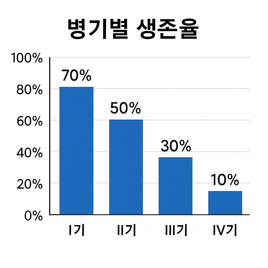 - 2기: 5년 생존율 50~60%, 항암치료로 재발률 감소