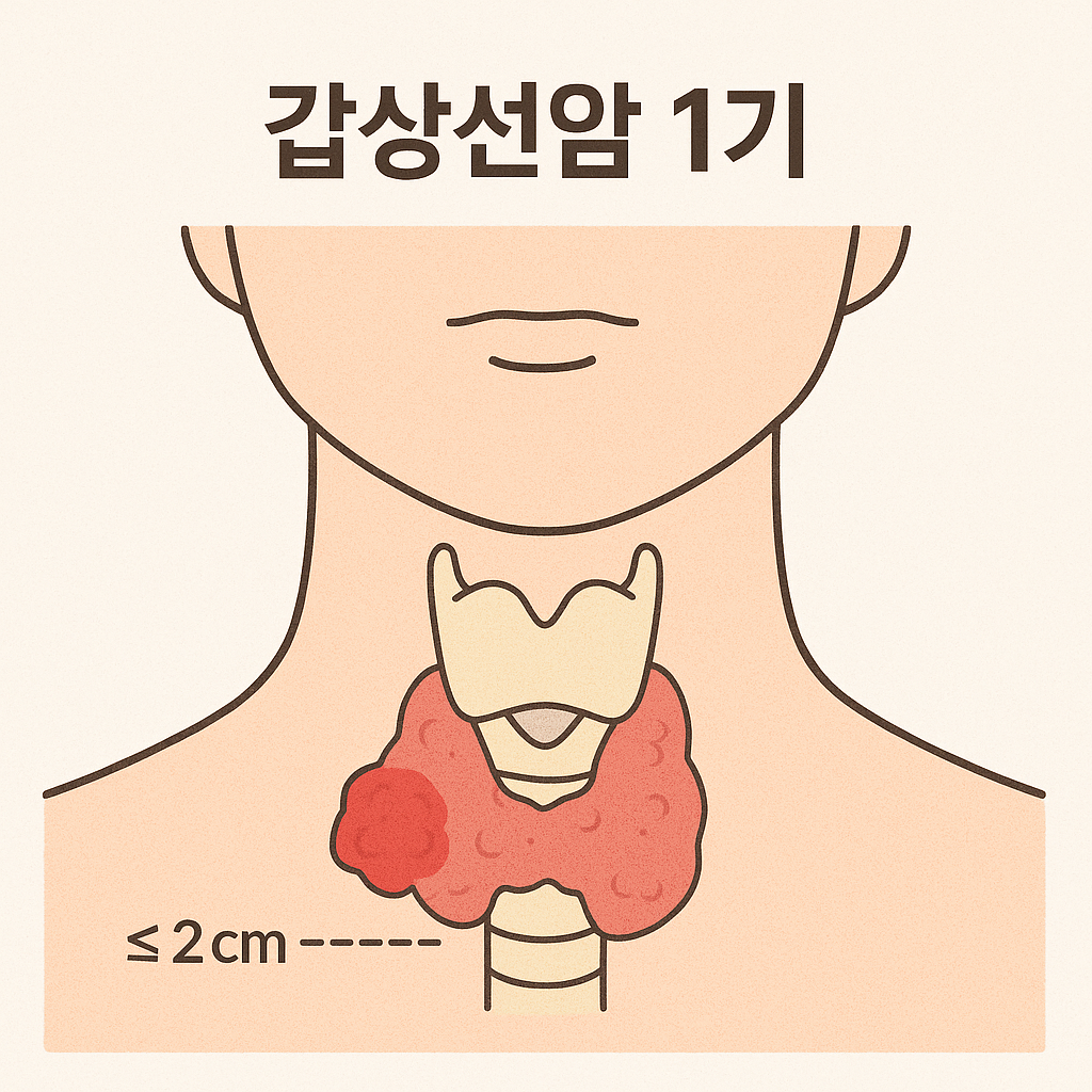 갑상선암 1기는 암의 크기가 2cm 이하이면서 림프절 전이 또는 원격 전이가 없는 상태를 말한다.