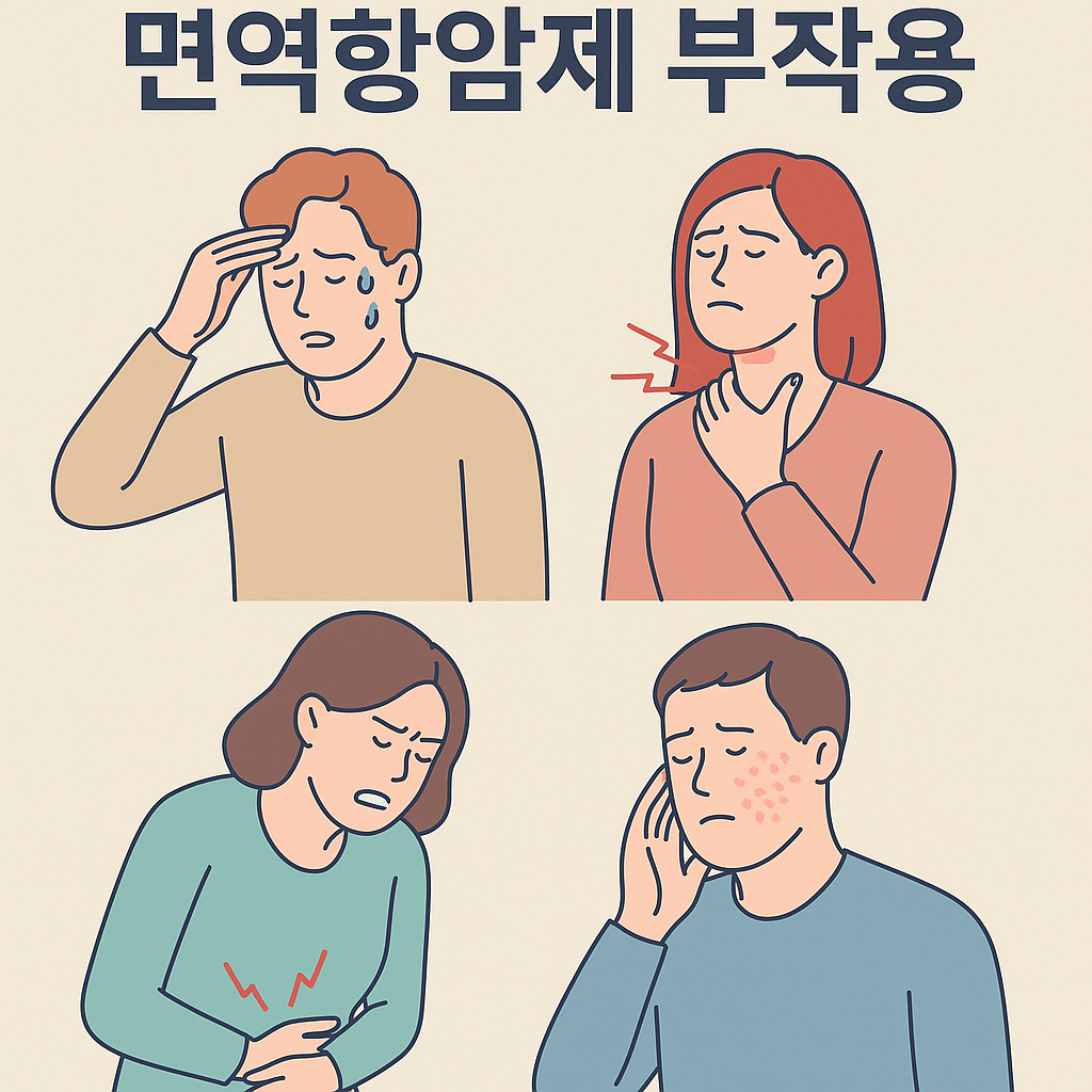면역항암제는 전통 항암제에 비해 부작용이 덜한 편이지만, **면역 관련 이상반응(immune-related adverse events, irAEs)**이 발생할 수 있다.
