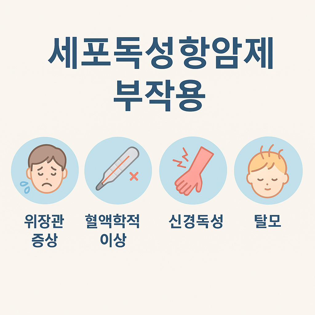 | 🔹 대표 부작용 | 구토, 설사, 백혈구 감소, 손발 저림, 탈모 등 |