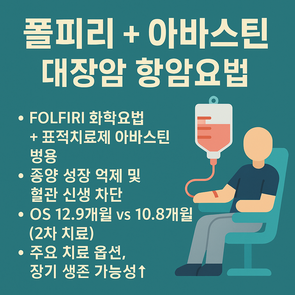 대장암 3기 이후 재발 또는 전이성 대장암 환자에게, 치료의 새로운 표준으로 자리 잡은 폴피리(FOLFIRI) + 아바스틴 요법이 주목받고 있다. 이 조합은 종양 억제와 혈관 신생 차단을 동시에 노려, 단독 화학요법보다 생존 기간을 확연히 늘린다. 최근 임상연구에서는 1·2차 치료 모두에서 뛰어난 성적을 보여주고 있다.