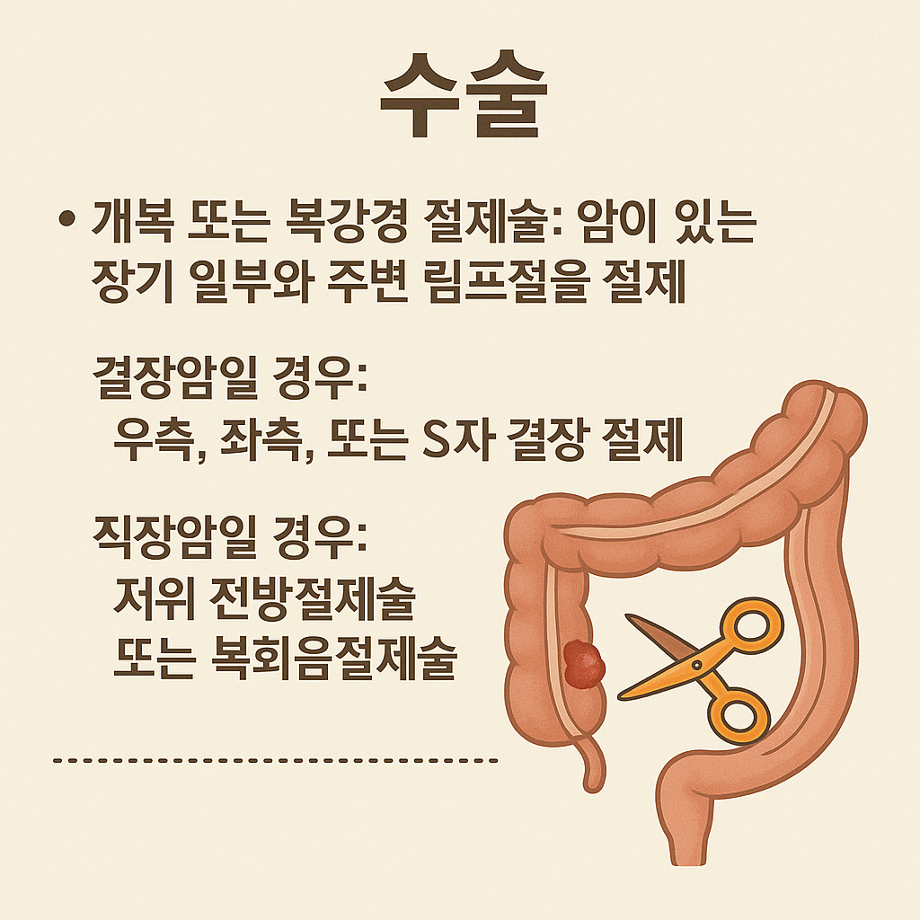- 개복 또는 복강경 절제술: 암이 있는 장기 일부와 주변 림프절을 절제