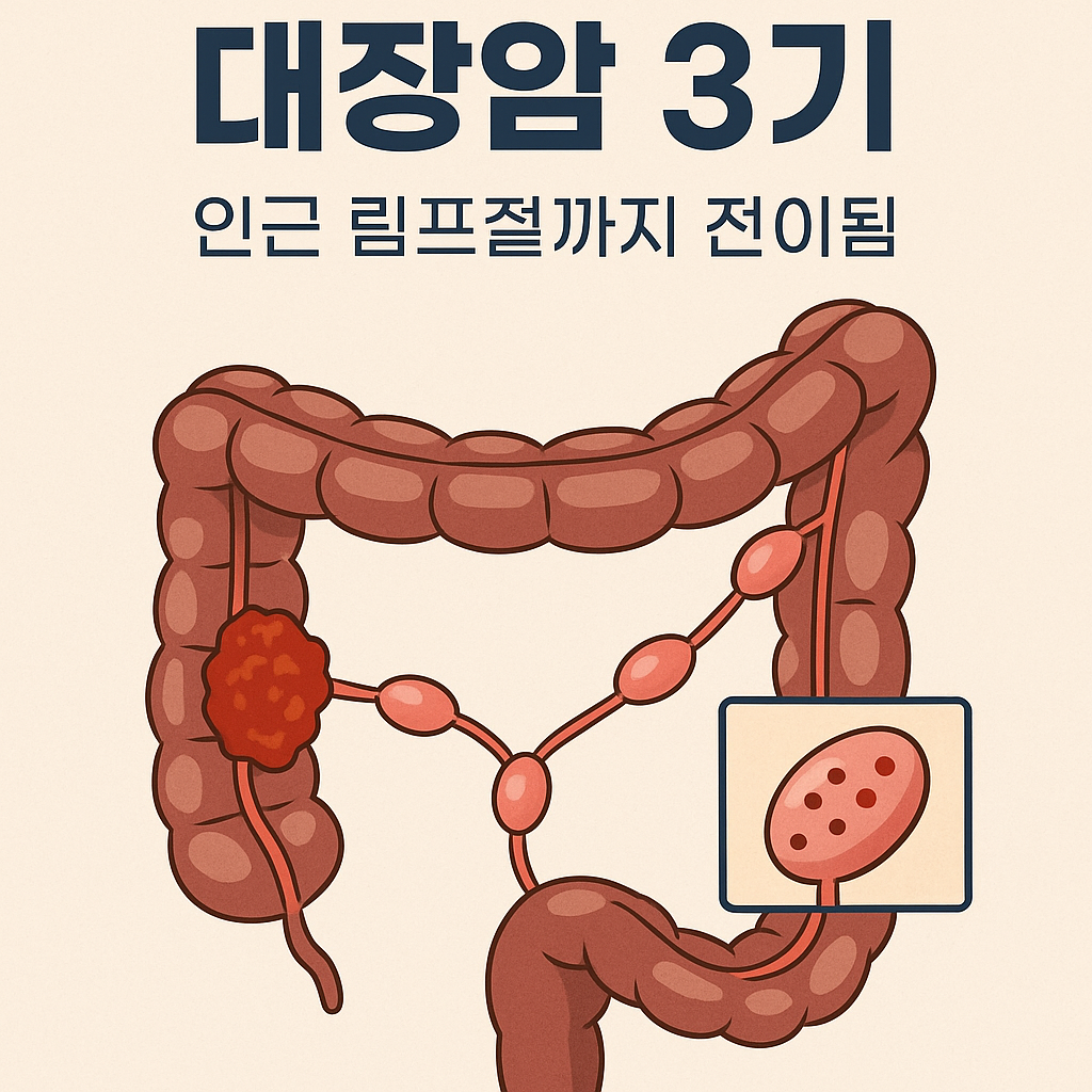 대장암 3기(colon cancer stage 3)는 암세포가 대장 벽을 뚫고 인접 림프절까지 전이된 상태를 의미합니다. 아직 간이나 폐 같은 먼 장기로 퍼진 **원격전이(M1)**는 없는 상태이며, 완치를 기대할 수 있는 마지막 단계로 여겨집니다.