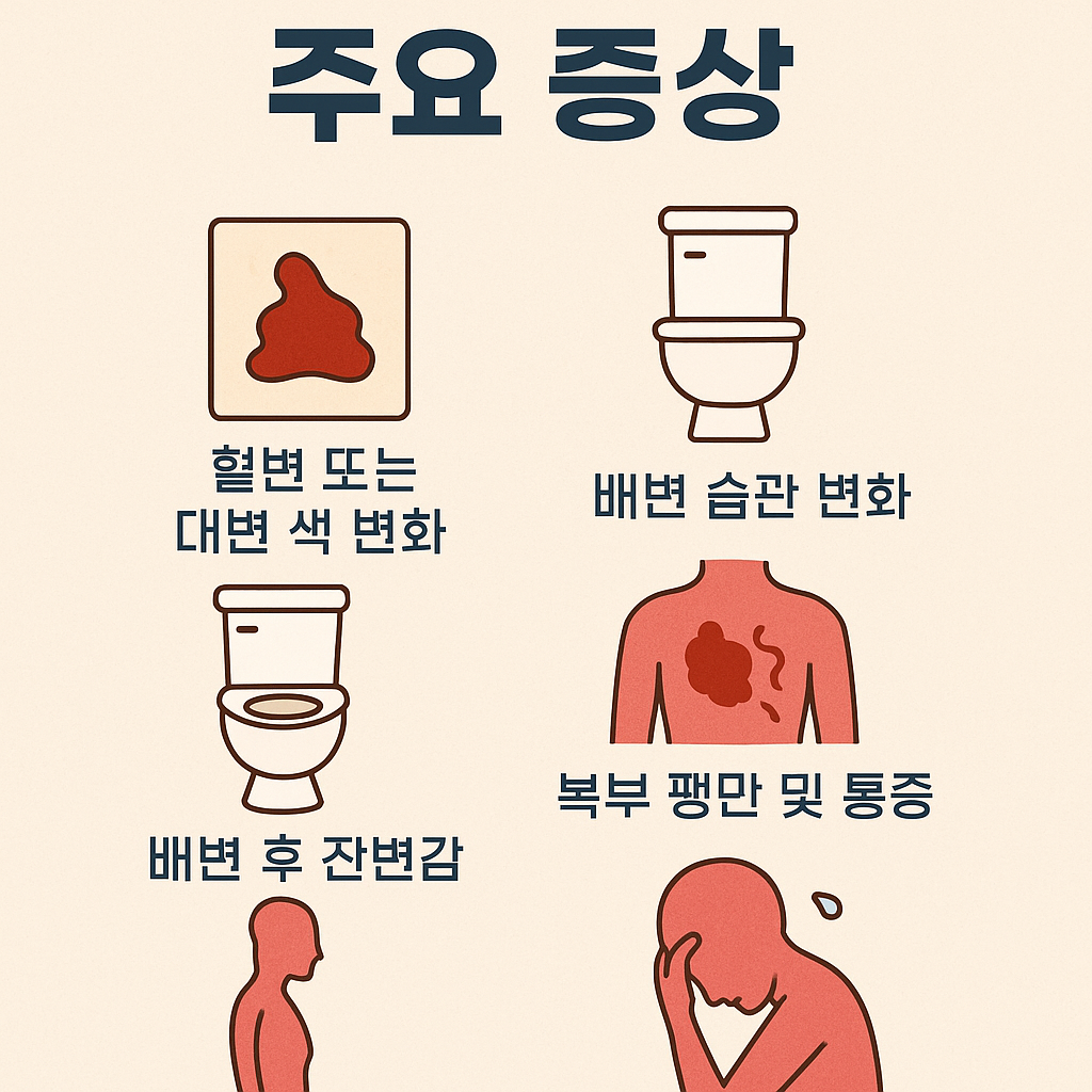 • 혈변 또는 대변 색 변화: 선홍색 또는 검붉은 변이 반복됨