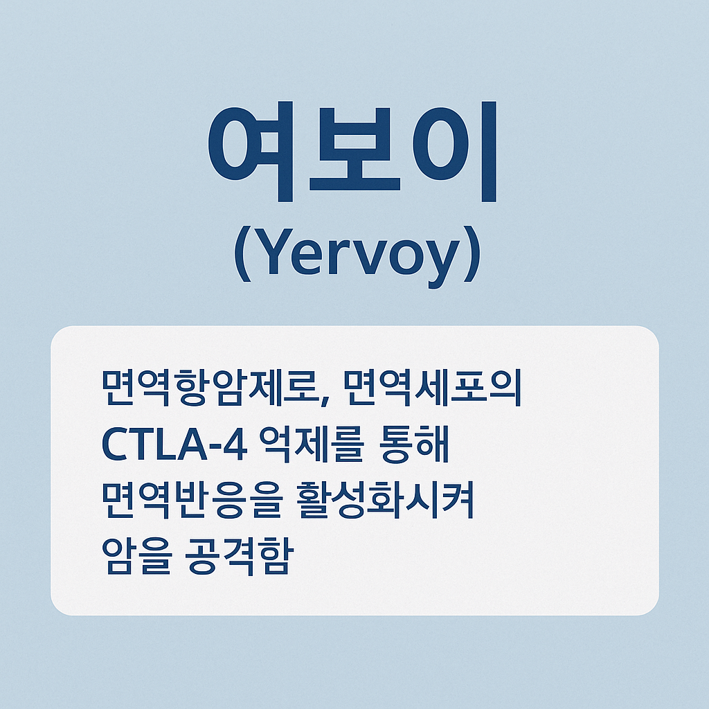 여보이(Yervoy, 성분명: 이필리무맙, Ipilimumab)는 미국 제약사 Bristol-Myers Squibb가 개발한 면역항암제로, CTLA-4 억제제로 분류된다. 2011년 미국 FDA에서 흑색종 치료제로 처음 승인되었으며, 우리나라 식약처에서도 이후 승인을 받아 다양한 암종에 사용되고 있다. 여보이는 암세포를 직접 죽이지 않고, 면역 시스템을 활성화시켜 스스로 암세포를 공격하게 만드는 면역관문억제제의 대표 주자 중 하나이다.